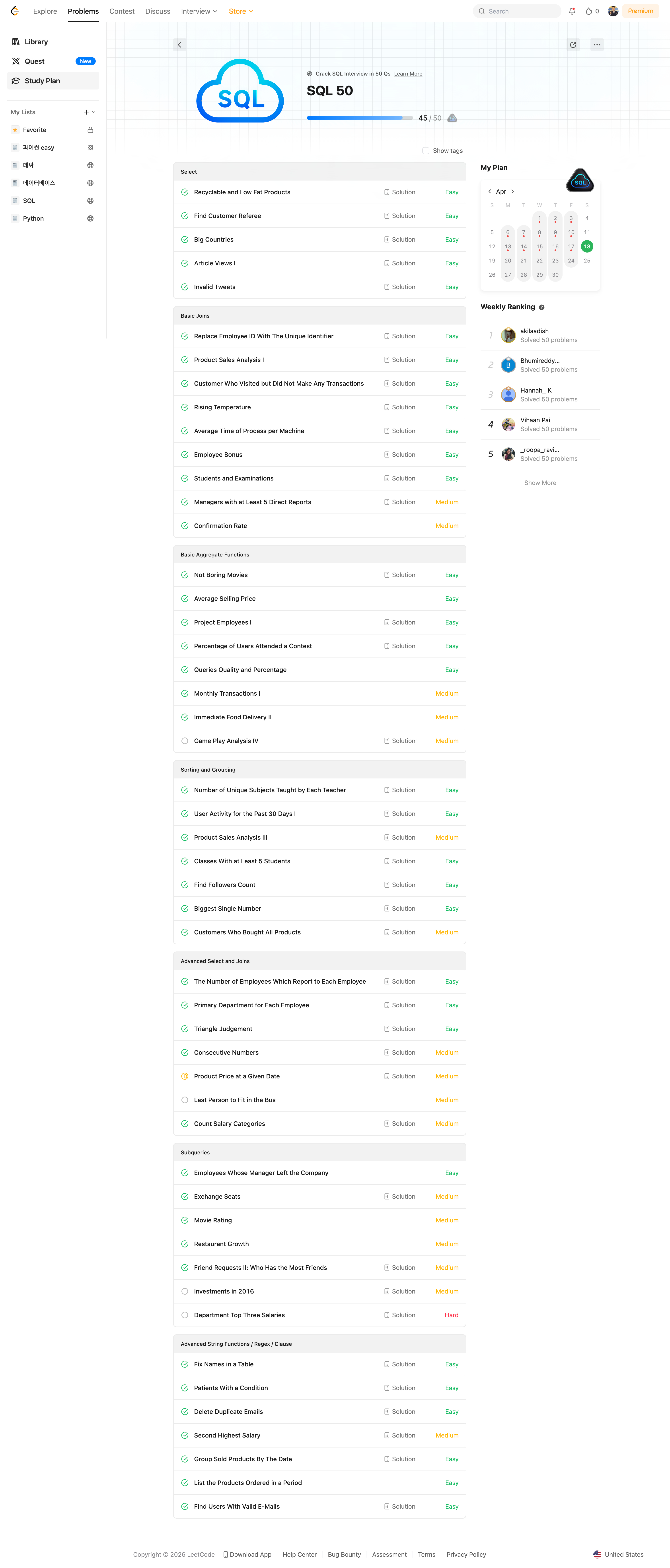 As I approached the job market, I wanted to benchmark my skills, so I tackled the LeetCode SQL 50 challenge. Interestingly, I found it significantly more approachable than the LeetCode Python tracks. While concepts like complex Joins and Subqueries occasionally presented hurdles, consistent daily practice helped me develop a strong intuition for them.